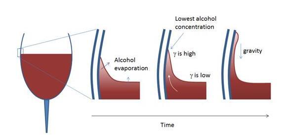 因此,這會(huì)在彎月面和葡萄酒與空氣間的平坦接觸表面之間形成濃度差,隨后將造成表面張力梯度(表面張力上大,下?。?,隨著時(shí)間推移,使彎月面沿著玻璃杯壁向上移動(dòng)。