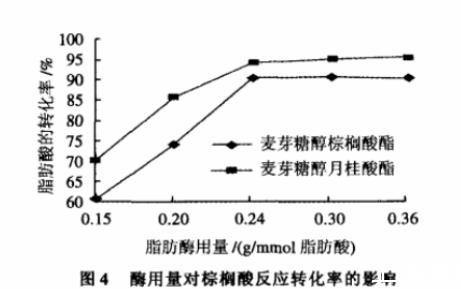 由圖4可見,在本實驗條件下,當(dāng)酶的用量增加時,脂肪酸的反應(yīng)轉(zhuǎn)化率增加。當(dāng)酶的用量為0.24g/mmol脂肪酸時,催化效果最好,棕櫚酸及月桂酸的反應(yīng)轉(zhuǎn)化率分別為達到90.6%和94.3%。