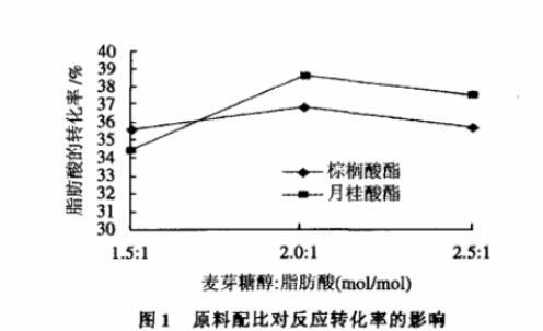 由圖1可知,在原料配比麥芽糖醇:脂肪酸酸分別使用1.5:1、2:1、2.5:1進行反應(yīng)時,麥芽糖醇:脂肪酸為2:1時,脂肪酸的反應(yīng)轉(zhuǎn)化率是最好的,但是,結(jié)果相差不大。即在本實驗條件下原料配比對反應(yīng)的影響較小。分析原因,是因為麥芽糖醇和脂肪酸為互不相溶體系,在反應(yīng)中,用丙酮做溶劑,即使能建立一個均相的反應(yīng)體系,由于麥芽糖醇在丙酮中的溶解度比較小,溶液中隨麥芽糖醇的量增加而改變不大。而當(dāng)麥芽糖醇達到一定用量后,會破壞原有的平衡,導(dǎo)致脂肪酸反應(yīng)的轉(zhuǎn)化率降低。所以,反應(yīng)中選擇麥芽糖醇:脂肪酸的配比為2:1為反應(yīng)的最佳配比。