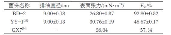 通過驅油試驗、表面張力和乳化指數(shù)的測定對菌株BD-2產(chǎn)生的生物表面活性劑性能進行分析,并與其他研究菌株比較,結果見表1。菌株BD-2產(chǎn)生的表面活性物質,能夠形成直徑約為9.0 cm的排油圈,可以將發(fā)酵液的表面張力由68.30 mN/m降到26.80 mN/m,乳化能力可達92.80%,與已發(fā)表的Shewanella sp.YY-1和Bacillus cereus GX7相比,菌株BD-2產(chǎn)生的生物表面活性劑具有較強的降低液面張力能力和乳化活性。