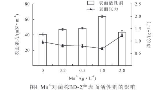 不同Mn2+、Fe2+濃度對菌株BD-2產(chǎn)表面活性劑的影響不同。由圖4可見,隨著Mn2+濃度的增加,表面活性劑量呈現(xiàn)先升高后降低的趨勢,而表面張力先下降后升高。Mn2+濃度0.5~1 g/L,表面活性劑量明顯升高,在1 g/L時,表面活性劑量最大,為2 g/L,而表面張力從30.9 mN/m下降到26.2 mN/m。在1%以后,表面活性劑量顯著下降(P<0.05),由2g/L下降到1.36 g/L,而表面張力顯著上升(P<0.05),由26.2 mN/m上升到39.2 mN/m。結果研究表明,菌株BD-2在Mn2+濃度為1 g/L的表面活性劑量最多,表面張力最小。因此,菌株BD-2的最適Mn2+濃度為1%。