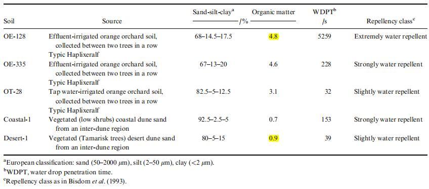 來(lái)自以色列不同地區(qū)的五種防水土壤 過(guò)篩(1 毫米)并在室溫下儲(chǔ)存在玻璃容器中 實(shí)驗(yàn)室條件(平均溫度 ? 24.5°C,平均 相對(duì)濕度 (RH) ? 65%)。 兩種土壤 (OE-128 和 OE-335; 典型的單氟草胺)是從相同的 污水灌溉的商業(yè)柑橘園與以前一樣 研究(Wallach 等人,2005 年;Graber 等人,2006 年)位于 以色列沿海平原的中部(31°59¢30.562)。 一 土壤(OT-28;典型單頭草)是從水龍頭中獲得的 同一商業(yè)果園的水灌溉柑橘地塊。 一種 沙丘沙是從附近的沙丘間地區(qū)獲得的 位于地中海的尼察尼姆自然保護(hù)區(qū) (31°16¢37.242) 海(Coastal-1)和來(lái)自沙間地區(qū)的粘土砂 內(nèi)蓋夫北部沙漠 (30°52¢02.592; (Desert-1) 的 Halutza 附近。表 1 列出了顯著的土壤特征。