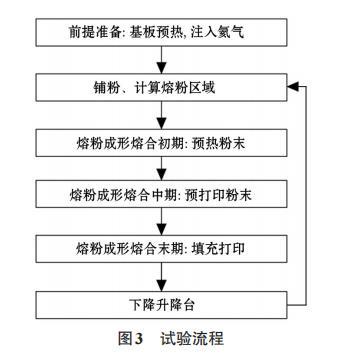 的當(dāng)量直徑,μm;ni為當(dāng)量直徑為di的顆粒的個(gè)數(shù)。計(jì)算可知,試驗(yàn)粉末的算術(shù)平均直徑為65μm。再取100 mL的試驗(yàn)粉料稱(chēng)重,凈重為0.40 kg;計(jì)算得到試驗(yàn)粉末體積孔隙率ε為0.49,因此粉末顆粒并非最緊密堆積狀態(tài)。熔粉制備了橫截面積為5 cm2,長(zhǎng)5 cm的圓棒,每層鋪粉0.10 mm,實(shí)驗(yàn)流程如圖3所示。