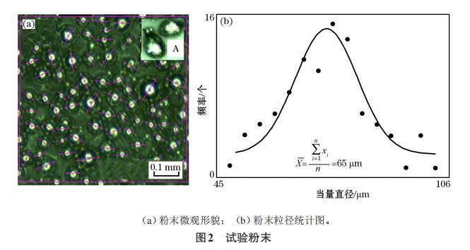 本文以不銹鋼316L(022Cr17Ni12Mo2)球粉為成形原料,顆粒直徑為45~106μm(如圖2所示)【316L不銹鋼的微觀組織:相鄰熔覆道之間的搭接良好。組織主要由胞狀晶和呈外延生長(zhǎng)的柱狀晶組成,柱狀晶的取向各不相同。由于熔池邊界處粉末未熔化區(qū)域溫度較低,因此一部分晶粒沿著熔池邊界外延生長(zhǎng),同時(shí)在SLM過(guò)程中,熔池內(nèi)部經(jīng)歷快速冷卻,表面張力形成梯度,熔池內(nèi)部存在“馬戈紊流”,熔池內(nèi)發(fā)生對(duì)流,導(dǎo)致熔池內(nèi)部散熱方向發(fā)生改變,因此,造成晶粒顯示出不同的生長(zhǎng)方向。胞狀晶呈正六邊形,為柱狀晶的截面,柱狀晶晶粒十分細(xì)小,直徑分布在0.4~0.7μm?!?,根據(jù)筆者已有的研究結(jié)果選擇合適的工藝,詮釋顆粒群的熔合線收縮和再結(jié)晶過(guò)程。由于試驗(yàn)粉末顆粒直徑分布廣,為了建立粉末計(jì)算模型,用式(1)、(2)計(jì)算了顆粒群的當(dāng)量直徑d和算術(shù)平均直徑d。