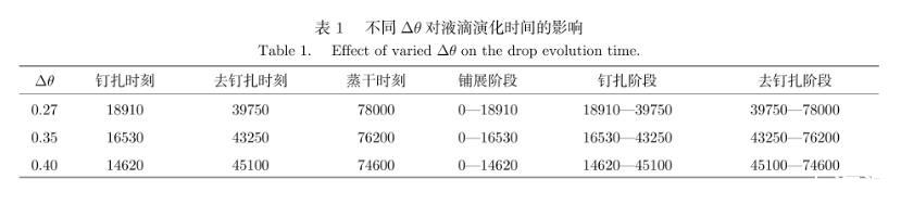 由表1可知,Δθ=0.27下液滴開始釘扎和去釘扎的時(shí)刻分別為t=18910和t=39750,Δθ=0.35下開始釘扎和去釘扎的時(shí)刻為t=16530和t=43250,而Δθ=0.40下則為t=14620和t=45100,即接觸線釘扎開始時(shí)刻提前,去釘扎時(shí)刻延后.由此可知,增大遲滯角,延長了接觸線釘扎時(shí)間,縮短了鋪展階段和去釘扎階段時(shí)長,同時(shí)加快了液滴蒸干歷程.