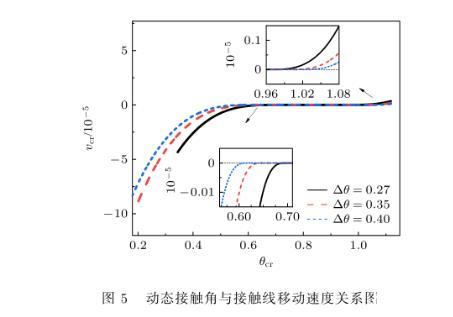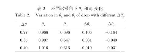 圖5比較了三種遲滯角下動態(tài)接觸角與接觸線移動速度間的對應(yīng)關(guān)系.可以看出,遲滯角對鋪展、釘扎和去釘扎階段等全過程均有不同程度的影響,在釘扎階段,Δθ=0.27下的液滴前進(jìn)接觸角和后退接觸角分別為θa=0.966和θr=0.696,Δθ=0.35和0.40下液滴對應(yīng)于θa=0.997,θr=0.647和θa=1.016,θr=0.616.如表2所列,隨著遲滯角的增大,前進(jìn)接觸角增大,后退接觸角減小,后退接觸角減小的幅度大于前進(jìn)接觸角增大的幅度,這與Karapetsas等的研究結(jié)果一致.因此,可通過改變遲滯角來改變前進(jìn)、后退接觸角,控制接觸線釘扎時(shí)間,從而調(diào)控液滴蒸發(fā).