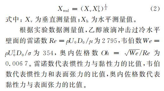 根據(jù)實驗數(shù)據(jù)測量值,乙醇液滴沖擊過冷水平壁面的雷諾數(shù)Re=ρU0D0/μ為2795,韋伯?dāng)?shù)We=ρU20D0/σ為354,奧內(nèi)佐格數(shù)Oh=We/Re為0.0067。雷諾數(shù)代表慣性力與黏性力的比值,韋伯?dāng)?shù)代表慣性力和表面張力的比值,奧內(nèi)佐格數(shù)代表黏性力與表面張力的比值。