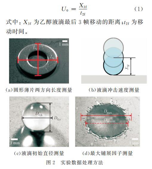 式中:X3f為乙醇液滴最后3幀移動的距離;t2f為移動時間。(a)圓形薄片兩方向長度測量(b)液滴沖擊速度測量(c)液滴初始直徑測量(d)最大鋪展因子測量圖2實驗數(shù)據(jù)處理方法