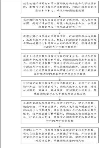 獲取玻璃纖維網(wǎng)格布的表面形貌結(jié)構(gòu)參數(shù)和化學(xué)性質(zhì)參數(shù),根據(jù)預(yù)設(shè)的浸膠工藝參數(shù)閾值,判斷纖維表面的浸潤性和親和力,確定初始浸膠量范圍;在玻璃纖維網(wǎng)格布表面進行等離子體處理,引入親水性基團,提高纖維表面能,增強與膠液的親和力,在低浸膠量的情況下實現(xiàn)高浸膠充分性;根據(jù)玻璃纖維網(wǎng)格布的纖維直徑、纖維間距等結(jié)構(gòu)參數(shù),采用有限元分析方法,模擬不同浸膠量下膠液在纖維表面的鋪展?fàn)顟B(tài)和纖維束內(nèi)部的滲透深度,獲得浸膠量與浸膠充分性的定量關(guān)系;基于上述浸膠量與浸膠充分性的定量關(guān)系,通過改變膠液配方中的助劑種類和用量,調(diào)控膠液的黏度和表面張力,獲得不同浸膠量下膠液分布均勻性的變化規(guī)律,結(jié)合浸膠充分性的要求,確定最佳膠液配方,膠液分布均勻性通過光學(xué)顯微鏡觀察和圖像分析軟件定量計算膠液在纖維表面的覆蓋率和厚度分布來描述;針對確定的最佳膠液配方和不同浸膠量,采用正交試驗設(shè)計方法,優(yōu)化浸膠時間、浸膠次數(shù)等工藝參數(shù),通過拉伸強度、耐堿性、彎曲強度、剪切強度性能測試,篩選出浸膠量與工藝參數(shù)的最佳匹配方案;采用數(shù)值模擬與機器學(xué)習(xí)相結(jié)合的方法,建立浸膠量、膠液性能、纖維表面性質(zhì)、浸膠工藝參數(shù)與浸膠效果之間的非線性預(yù)測模型,通過優(yōu)化算法尋找各參數(shù)的最優(yōu)組合,指導(dǎo)浸膠量的精確控制,浸膠效果包括浸膠充分性、膠液分布均勻性、纖維束內(nèi)部滲透深度和最終復(fù)合材料的力學(xué)性能指標(biāo);在實際生產(chǎn)中,根據(jù)預(yù)測模型設(shè)定浸膠量和工藝參數(shù),通過在線監(jiān)測膠液黏度、表面張力等參數(shù),并結(jié)合機器視覺對浸膠后網(wǎng)格布表面形貌的檢測,實現(xiàn)浸膠量的實時反饋控制,確保浸膠質(zhì)量的穩(wěn)定性。
