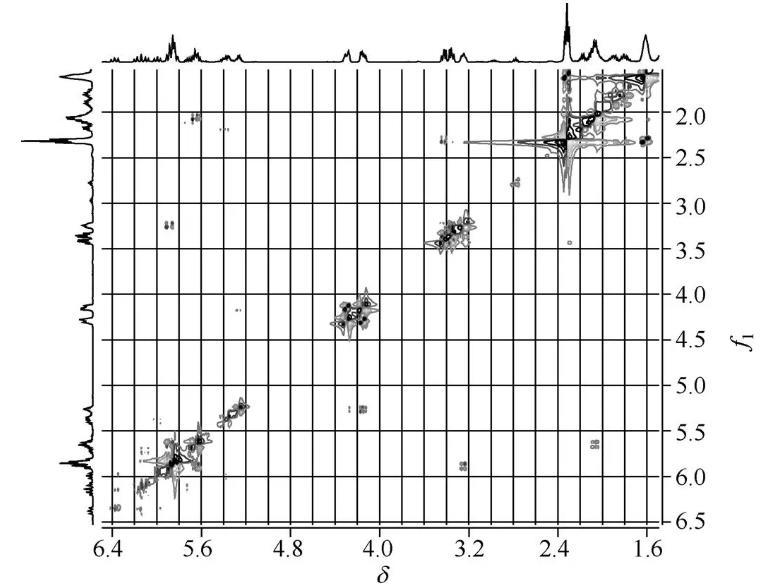 桐油及桐油酸酐的1H NMR見圖2,從圖中可以看出,隨著加成反應的進行,桐油中的烯鍵上的氫信號(8~13),TM2烯鍵上的氫信號(11~17)及TM3烯鍵上的氫信號(11~13)明顯減弱,峰型也發(fā)生很大變化。依據(jù)圖2(b)中的各峰積分面積比例確定桐油與兩個馬來酸酐反應形成TM2,進一步與馬來酸酐反應,共軛三烯的氫信號[圖2(b)中14~17]完全消失。由于桐油結(jié)構(gòu)較復雜,1H NMR歸屬較困難,TM 2經(jīng)1H-1H COSY譜(圖3)分析,從圖3中可以看出,信號3和6相關(guān),為甘油酯緊連的兩個亞甲基氫;6′和8相關(guān),為新生成的六元環(huán)相鄰的兩個氫;5和5′分別與12和12′相關(guān),7和13、13′相關(guān),9和10相關(guān),11和14相關(guān),14和17相關(guān),12、17與15、16相關(guān)。結(jié)合圖2(b)、圖2(c)中信號7、8、9的積分比例分別為1∶2∶2及3∶6∶4,及TM2的1H-1H COSY譜分析,TM2及TM3結(jié)構(gòu)各質(zhì)子信號歸屬如圖2所示。