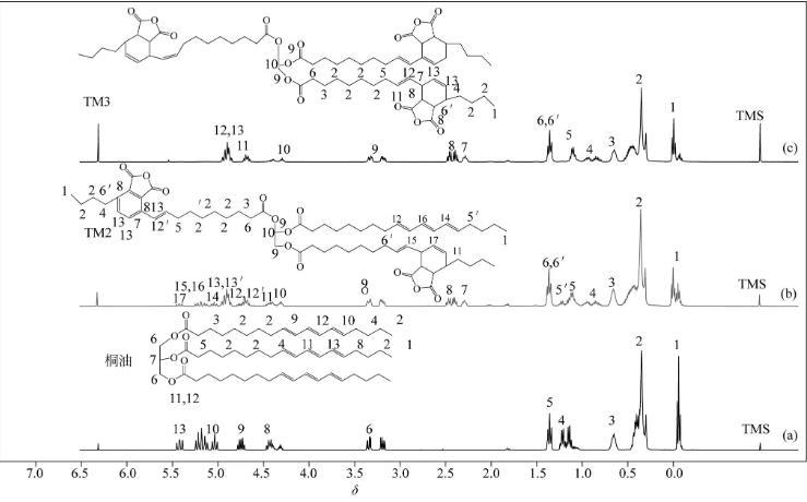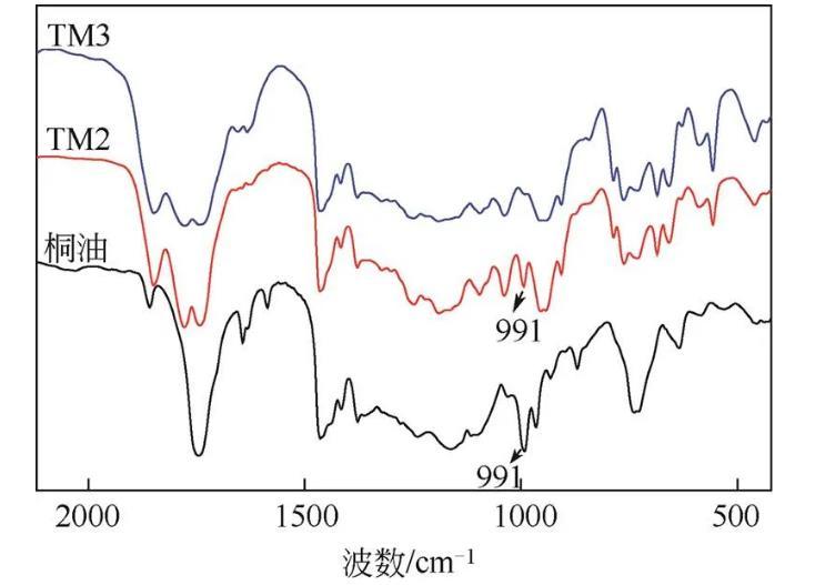 桐油中的共軛不飽和鍵與馬來酸酐易發(fā)生Diels-Alder(D-A)反應,生成桐油酸酐,反應條件對產(chǎn)物的分布具有重要影響。由于桐油為混合物,每分子中有3條不飽和鏈,控制MA的加入量及反應條件,可以控制桐油二酸酐(TM2)和桐油三酸酐(TM3)的形成。文獻報道大多數(shù)桐油和馬來酸酐反應以有機錫為催化劑,經(jīng)過研究發(fā)現(xiàn),溫度對馬來酸酐與桐油反應影響較大,溫度低反應很慢,有機錫催化劑并不能明顯降低反應溫度。在無催化劑的條件下,以紅外光譜跟蹤80℃、100℃、120℃及140℃下桐油與3倍量的馬來酸酐反應的情況,結(jié)果表明80℃下反應緩慢,100℃反應1h后桐油的共軛三鍵的紅外吸收峰幾乎完全消失,反應程度能達到96%。桐油及桐油酸酐的FTIR如圖1所示,991cm–1為桐油共軛三鍵的面外彎曲振動紅外吸收峰,兩倍量馬來酸酐與桐油反應的產(chǎn)物(TM2)中991cm–1的吸收峰明顯減弱但未消失,3倍量馬來酸酐與桐油反應的產(chǎn)物中該峰完全消失,說明桐油分子上的共軛三鍵可以同馬來酸酐反應形成三酸酐TM3。