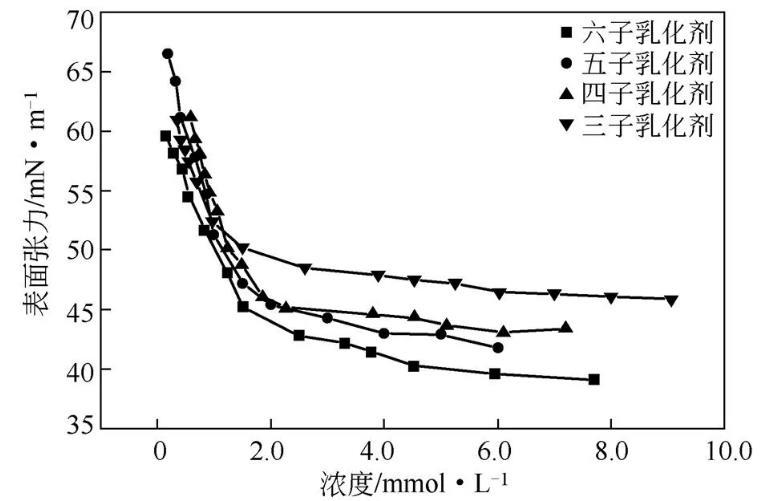 將桐油三酸酐和桐油三酸酐與甲基丙烯酸β羥乙酯反應后的產(chǎn)物TM3H1及TM3H2水解,形成羧基官能團數(shù)為4~6的丙烯酸酯改性的桐油基衍生物,TM3H3含有3個羧基。將羧酸改性的桐油用堿等當量中和,形成含3~6個羧酸鈉基團的桐油基衍生物,簡稱為3~6子乳化劑。桐油及乳化劑的表面張力測試結(jié)果如圖5所示,與純水(實測表面張力69mN/m)相比,4種多子乳化劑均能降低水的表面張力。表面張力隨其濃度的增加而下降,當乳化劑濃度大于2.5mmol時,溶液的表面張力隨濃度的變化趨于平穩(wěn),逐漸接近水平。乳化劑濃度為1.5mmol/L時,3~6子乳化劑表面張力分別為50.2mN/m、48.8mN/m、47.2mN/m和45.2mN/m。