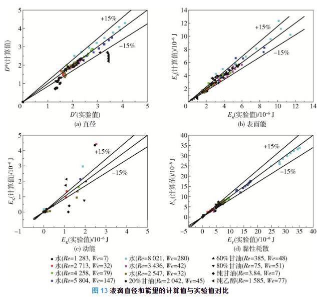 圖13液滴直徑和能量的計(jì)算值與實(shí)驗(yàn)值對(duì)比