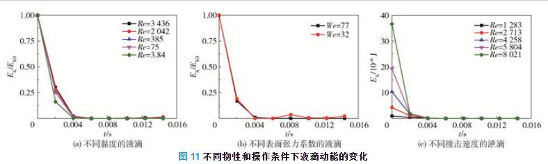 圖11不同物性和操作條件下液滴動(dòng)能的變化