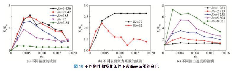 圖10為不同物性和操作條件下液滴表面能的變化。由圖4(a)、圖7(a)和式(19)均可得到液滴鋪展直徑和鋪展面積隨時(shí)間先增大后減小的一般規(guī)律,且隨著黏度的增加,液滴的鋪展直徑和鋪展面積均減小,液滴表面能增加的速率也在降低。