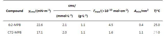 我們進(jìn)一步探究了C72-MPB與化合物6:2-MPB表面性能的差異,使用Gibbs方程對(duì)rcmc的值進(jìn)行計(jì)算,由rcmc進(jìn)一步計(jì)算在cmc處每個(gè)分子在空氣~水界面的表面活性劑所占面積,即Amin: