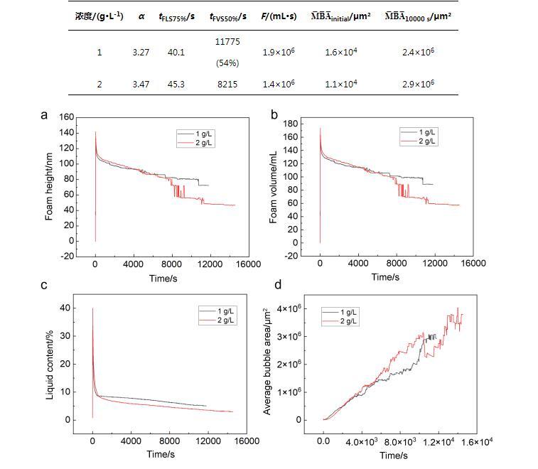 圖4表面活性劑水溶液中泡沫性能的表征。(a)泡沫高度的比較。(b)泡沫體積比較。(c)表面活性劑中液體含量的比較。(d)平均氣泡面積的比較