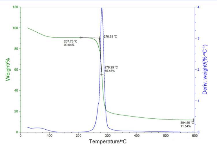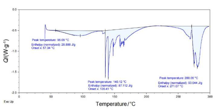 TGA圖中可以看到樣品的失重主要集中在100℃以下和250℃到300℃,DSC圖中可以看出樣品的吸熱主要有三個區(qū)域,分別在100℃以下,140——170℃和260——300℃。結(jié)合TGA和DCS來看,在溫度100℃以下部分是少量溶劑及產(chǎn)物中的水蒸發(fā),溫度達到140℃時,DSC中有吸熱峰,但TGA曲線沒有變化,說明產(chǎn)物發(fā)生相變,從固體轉(zhuǎn)變?yōu)橐后w,直到250℃左右開始失重,最終仍有11.54%固體剩余證明一定存在分解現(xiàn)象并產(chǎn)生固體產(chǎn)物,結(jié)合DSC圖中有多個吸熱峰來看推測是產(chǎn)物有多步分解,也不排除存在部分的汽化失重的可能性。