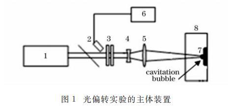 實(shí)驗(yàn)裝置的主體部分如圖1所示,脈沖Nd∶YAG激光1(波長(zhǎng)1.06μm,脈寬10ns,最大激光能量500mJ)經(jīng)過(guò)分光鏡2,衰減片3和擴(kuò)束裝置4,由會(huì)聚透鏡5(焦距150mm)聚焦于銅靶7上。水槽8里裝有具有不同表面張力的液體。能量計(jì)6用來(lái)實(shí)時(shí)監(jiān)測(cè)入射激光的能量。實(shí)驗(yàn)中靶面焦斑半徑為50μm.