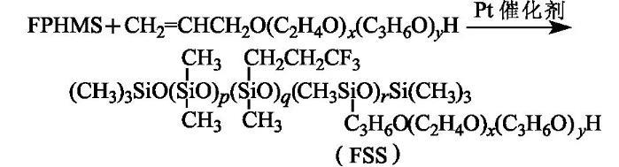 按n(Si-H)∶n(C=C)=1∶1比例將FPHMS和F6以及溶劑異丙醇加入裝有攪拌器、回流冷凝管和溫度計的四口燒瓶中,通N2,攪拌15 min,然后升溫至70——90℃,再滴加氯鉑酸醇溶液(以鉑計,占總單體質(zhì)量分?jǐn)?shù)的4.0×10-5),并保溫反應(yīng)4——6 h后,于90℃、60 kPa真空脫低沸物30 min,冷卻,得淺褐色至褐色透明液體,即氟硅表面活性劑(FSS),其黏度為850 mPa·s,并溶于冷、熱水。反應(yīng)式為: