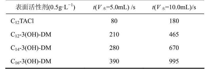 采用量筒法進(jìn)行表面活性劑乳化力的測(cè)定,結(jié)果見(jiàn)表4。雙子表面活性劑比傳統(tǒng)單子表面活性劑十二烷基三甲基氯化銨[1-2,22]分出相同體積水的時(shí)間長(zhǎng),且隨著烷基碳鏈長(zhǎng)度的增加,水相所分離出水量所用的時(shí)間也越長(zhǎng)。這可能是因?yàn)樵谟?水界面上,吸附的表面活性劑分子之間排列越緊密,形成界面的膜強(qiáng)度越高。根據(jù)單分子吸附膜理論,界面張力減小,乳化性能越好,表現(xiàn)為從乳狀液中分離出水所用的時(shí)間越長(zhǎng)。隨著烷基碳鏈長(zhǎng)度的增加,碳?xì)滏滈g的相互作用力更強(qiáng),兩個(gè)表面活性劑單體分子之間的連接更加緊密,形成的界面膜強(qiáng)度也越高,因此烷基碳鏈長(zhǎng)度越長(zhǎng)的雙子表面活性劑的乳化效果越好。