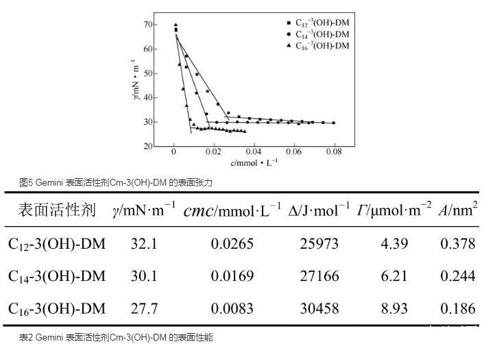 (2)測(cè)定了Cm-3(OH)-DM在水溶液中的表面張力、cmc以及其熱力學(xué)常數(shù),得到其cmc分別為0.0265mmol/L、0.0169mmol/L、0.0083mmol/L,γcmc分別為32.1mN/m、30.1mN/m、27.7mN/m。以上數(shù)據(jù)表明與對(duì)應(yīng)的傳統(tǒng)單子表面活性劑相比,Gemini表面活性劑Cm-3(OH)-DM(m=12,14,16)具有很好的表界面活性。