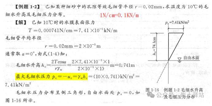 來自《土力學》式中,水膜張力T與溫度有關,單位:N/cm或KN/m;10°時,T=7.41×10-4N/cm=7.41×10-5KN/m;方向與毛細管成夾角α,該角度的大小與土顆粒礦物成分和水性質(zhì)有關;