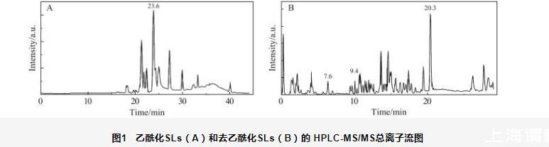 圖1乙?;疭Ls(A)和去乙?;疭Ls(B)的HPLC-MS/MS總離子流圖