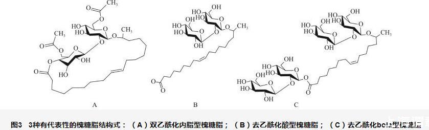 圖3 3種有代表性的槐糖脂結(jié)構(gòu)式:(A)雙乙酰化內(nèi)脂型槐糖脂;(B)去乙?;嵝突碧侵?;(C)去乙?;痓ola型槐糖脂