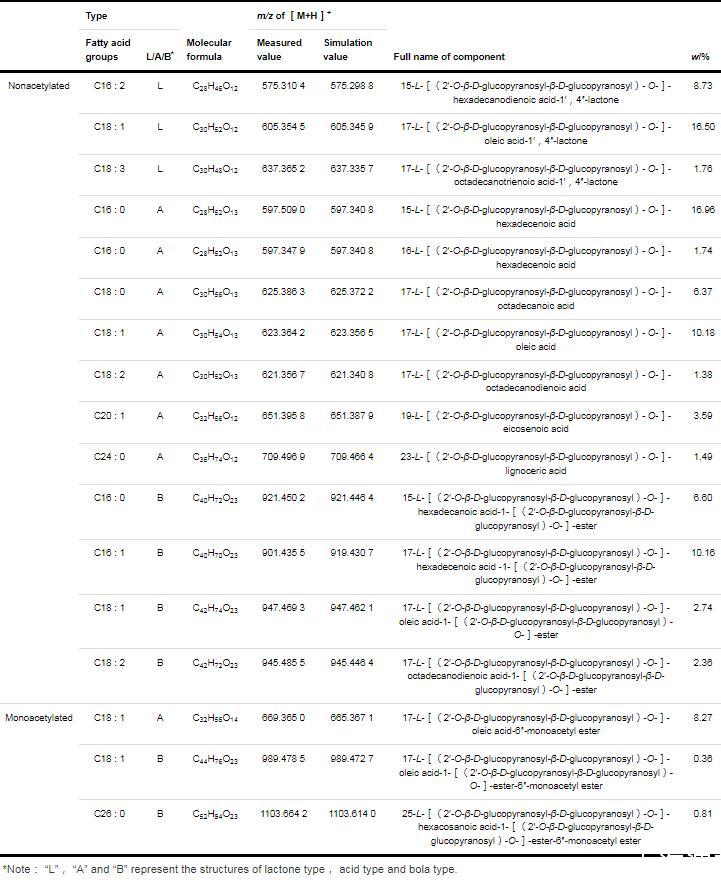 在去乙酰化SLs同系物的總離子流圖中,保留時(shí)間為20.3 min的峰具有最高的豐度,達(dá)到16.96%,所對(duì)應(yīng)的質(zhì)譜碎片如圖2B所示,其中,m/z 597.5090為[M+H]+峰,m/z 619.4906為[M+Na]+峰,該組分與保留時(shí)間為9.4 min的組分具有相同的[M+Na]+和[M+H]+峰(圖2C),推測這2種組分可能為同分異構(gòu)體;對(duì)于保留時(shí)間為9.4 min的質(zhì)譜圖(圖2C),其中,m/z 619.3302和597.3479分別為[M+Na]+峰和[M+H]+峰,而m/z 435.2949和273.2423分別是[M+H]+失去1個(gè)和2個(gè)去乙?;募禾黔h(huán)(C6H10O5)形成的,m/z 273.2423(C16H33O3)是質(zhì)子化的C16∶0羥基脂肪酸。上述分析表明,保留時(shí)間20.3和9.4 min的組分分別為ω型和ω-1型C16∶0的去乙?;嵝蚐Ls,即16-L-[(2'-O-β-D-吡喃葡萄糖基-β-D-吡喃葡萄糖基)-O-]-十六酸和15-L-[(2'-O-β-D-吡喃葡萄糖基-β-D-吡喃葡萄糖基)-O-]-十六酸。