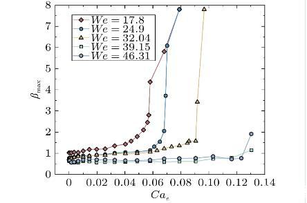 圖6描述了不同韋伯?dāng)?shù)下液滴最大無量綱拉伸系數(shù)βmax的對(duì)比趨勢(shì)。最大拉伸系數(shù)值是在式(5)的基礎(chǔ)上求?。害耺ax=Hmax/D0,其中Hmax為液滴在撞擊過程中達(dá)到的最大拉伸高度??梢园l(fā)現(xiàn),當(dāng)實(shí)驗(yàn)條件設(shè)定為低韋伯?dāng)?shù)和高電毛細(xì)數(shù)時(shí),液滴的最大拉伸系數(shù)明顯增大,甚至在此條件下部分液滴產(chǎn)生了射流模態(tài),所形成的液絲長(zhǎng)度超出了上極板的界限。除此之外,前三組韋伯?dāng)?shù)下的液滴撞擊實(shí)驗(yàn)結(jié)果分析,得到結(jié)論:韋伯?dāng)?shù)的增大,直接導(dǎo)致液滴達(dá)到噴射狀態(tài)所需的電毛細(xì)數(shù)相對(duì)應(yīng)增大。