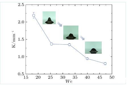 為了更加清晰地表明液滴撞擊的We對(duì)三種模態(tài)的影響,根據(jù)實(shí)驗(yàn)結(jié)果總結(jié)了撞擊We與電毛細(xì)力Cae的關(guān)系,如圖7所示。函數(shù)結(jié)果表明,第一模態(tài)可以發(fā)生在所有韋伯?dāng)?shù)內(nèi),并且隨著韋伯?dāng)?shù)的增加,第一模態(tài)的閾值電場(chǎng)也在不斷增加。第二模態(tài)的閾值電場(chǎng)范圍是三種模態(tài)中最小的,韋伯?dāng)?shù)越大時(shí)需要更強(qiáng)的電場(chǎng)才能產(chǎn)生第二模態(tài)。第三模態(tài)的閾值電場(chǎng)隨著韋伯?dāng)?shù)的增加也在不斷增大,只是液滴出現(xiàn)第三模態(tài)的電場(chǎng)范圍在減小。這可能是由于韋伯?dāng)?shù)的變化導(dǎo)致拉伸液滴形態(tài)的變化,從而影響了靜電力的強(qiáng)度?;谏鲜隹紤],為了深入剖析三種模態(tài)閾值電場(chǎng)變化的原因,根據(jù)實(shí)驗(yàn)結(jié)果對(duì)無外加電場(chǎng)條件下液滴拉伸過程中韋伯?dāng)?shù)We與平均頂點(diǎn)曲率K(如式7所示)的關(guān)系進(jìn)行了討論,如圖8所示。從關(guān)系圖中可以看出,當(dāng)液滴處于回縮階段并達(dá)到最大拉伸高度時(shí),韋伯?dāng)?shù)的增加會(huì)伴隨著液滴頂部曲率半徑的增大,而曲率半徑的增大將會(huì)導(dǎo)致靜電力的相對(duì)減弱。