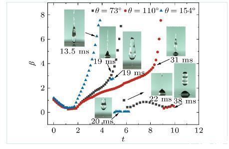 圖10液滴拉伸系數(shù)與不同接觸角的關(guān)系(We=17.8、Cae=0.068)