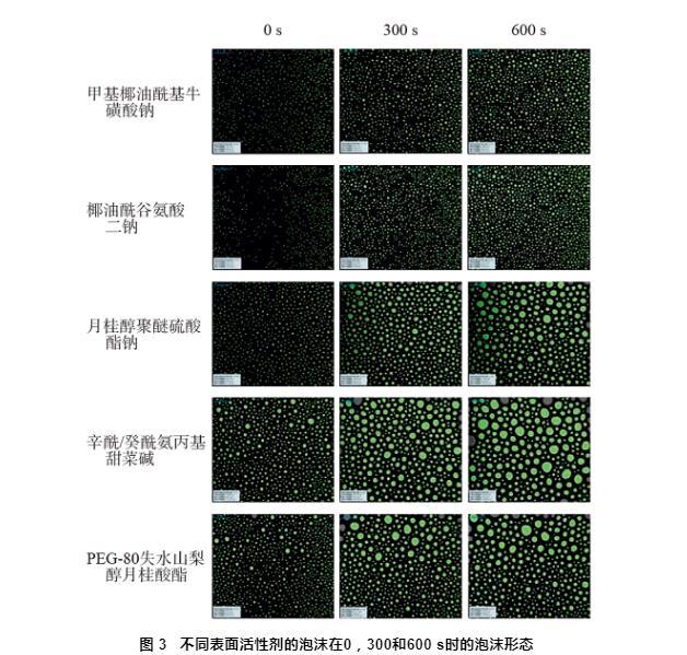 圖3不同表面活性劑的泡沫在0,300和600 s時(shí)的泡沫形態(tài)