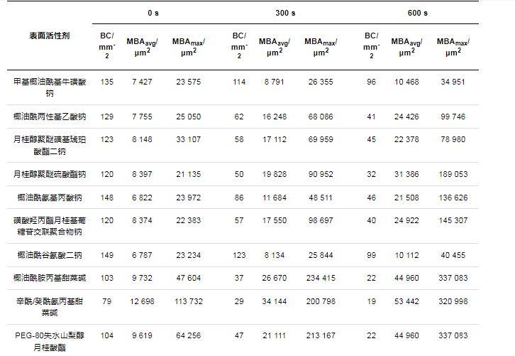 表面活性劑的泡沫形態(tài)數(shù)據(jù)如表3所示,包括10種表面活性劑溶液在產(chǎn)生最大泡沫體積之后的0,300和600 s時(shí)的泡沫密度(BC)、平均氣泡面積(MBAavg)和最大氣泡面積(MBAmax);同時(shí),選取了5種具有代表性的表面活性劑,對(duì)其泡沫形態(tài)進(jìn)行拍照觀察,如圖3所示。最初,所有陰離子表面活性劑的氣泡都非常小且均勻,其中椰油酰谷氨酸二鈉、椰油酰氨基丙酸鈉和甲基椰油?;;撬徕c這3種氨基酸表面活性劑的平均氣泡面積分別為6 787,6 822和7 427μm2;而兩性和非離子表面活性劑的平均氣泡面積較大,其中椰油酰胺丙基甜菜堿為9 732μm2、辛酰/癸酰氨丙基甜菜堿為12 698μm2、PEG-80失水山梨醇月桂酸酯為9 619μm2。在600 s時(shí),大多數(shù)陰離子表面活性劑氣泡的平均面積在30 000μm2以內(nèi),椰油酰兩性基乙酸鈉的平均氣泡面積為24 426μm2,其余兩性和非離子表面活性劑的平均氣泡面積均大于40 000μm2,其中辛酰/癸酰氨丙基甜菜堿達(dá)到53 442μm2。以上結(jié)果表明,甲基椰油酰基?;撬徕c、椰油酰谷氨酸二鈉具有較好的泡沫形態(tài)穩(wěn)定性,600 s后其泡沫密度和氣泡面積變化相對(duì)較小,而椰油酰胺丙基甜菜堿、辛酰/癸酰氨丙基甜菜堿、PEG-80失水山梨醇月桂酸酯的泡沫密度和氣泡面積變化相對(duì)較大,其泡沫形態(tài)穩(wěn)定性較差。