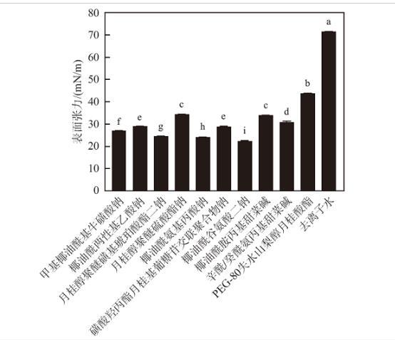將10種表面活性劑的去離子水溶液(pH=6.0)進(jìn)行表面張力測(cè)定,結(jié)果如圖1所示。去離子水的表面張力為71.81 mN/m;所有表面活性劑均可顯著降低去離子水的表面張力,其中PEG-80失水山梨醇月桂酸酯降低表面張力的能力最差,為43.73 mN/m;月桂醇聚醚硫酸酯鈉和椰油酰胺丙基甜菜堿水溶液的表面張力無(wú)顯著差異,分別為34.14和33.87 mN/m;辛酰/癸酰氨丙基甜菜堿水溶液的表面張力為30.54 mN/m;椰油酰兩性基乙酸鈉和磺酸羥丙酯月桂基葡糖苷交聯(lián)聚合物鈉水溶液的表面張力無(wú)顯著差異,分別為28.88和28.71 mN/m;甲基椰油酰基?;撬徕c水溶液的表面張力為26.74 mN/m;月桂醇聚醚磺基琥珀酸酯二鈉水溶液的表面張力為24.16 mN/m;椰油酰氨基丙酸鈉水溶液的表面張力較低,為23.84 mN/m;椰油酰谷氨酸二鈉水溶液的表面張力最低,為22.08 mN/m。