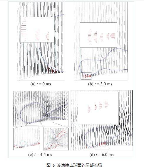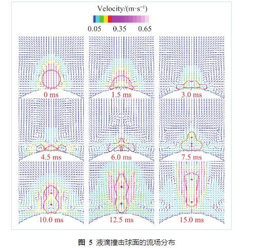 為了研究液滴撞擊高溫球面過程中液滴與氣膜的動力學(xué)及傳熱學(xué)特性,以液滴撞擊623.15 K球面為例展開模擬,液滴的撞擊速度為0.348 m/s,尺寸為d=1.61 mm,We=8.6.圖4展示了液滴撞擊過程中速度場、溫度場及壓力場的變化,圖5展示了液滴撞擊過程中流場的變化。