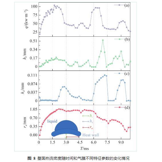 從圖7可以看出,相對于壓強(qiáng)的變化情況,壁面的熱流密度與氣膜的相關(guān)性更強(qiáng),氣膜厚度的變化會引起熱流密度的變化。圖8是液滴撞擊過程中壁面平均熱流密度及氣膜不同特征參數(shù)隨時間的變化情況,圖8(a)是壁面平均熱流密度,可以看出,平均熱流密度的變化情況受液滴中心氣膜厚度影響較大,在前期鋪展階段中心氣膜厚度出現(xiàn)明顯波動時熱流密度也相應(yīng)波動,在液滴收縮階段,熱流密度變化明顯與頸部氣膜厚度成正相關(guān);圖8(b)是液滴中心氣膜高度,中心氣膜高度波動最為劇烈,在液滴撞擊前3 ms內(nèi),即液滴鋪展階段先伴隨不穩(wěn)定波動升高再保持穩(wěn)定,當(dāng)液滴開始收縮時出現(xiàn)大范圍的波動;圖8(c)是液滴頸部氣膜厚度,頸部與中心點通常為液滴底部氣膜厚度最薄點,也是熱流密度峰值點;圖8(d)是液滴的頸部半徑長度,它的變化規(guī)律與液滴鋪展情況相似,且可以用來表示液滴與壁面的有效換熱面積。相較其他兩項特征參數(shù)而言,液滴中心氣膜厚度顯然對熱力學(xué)能具有更高的影響。
