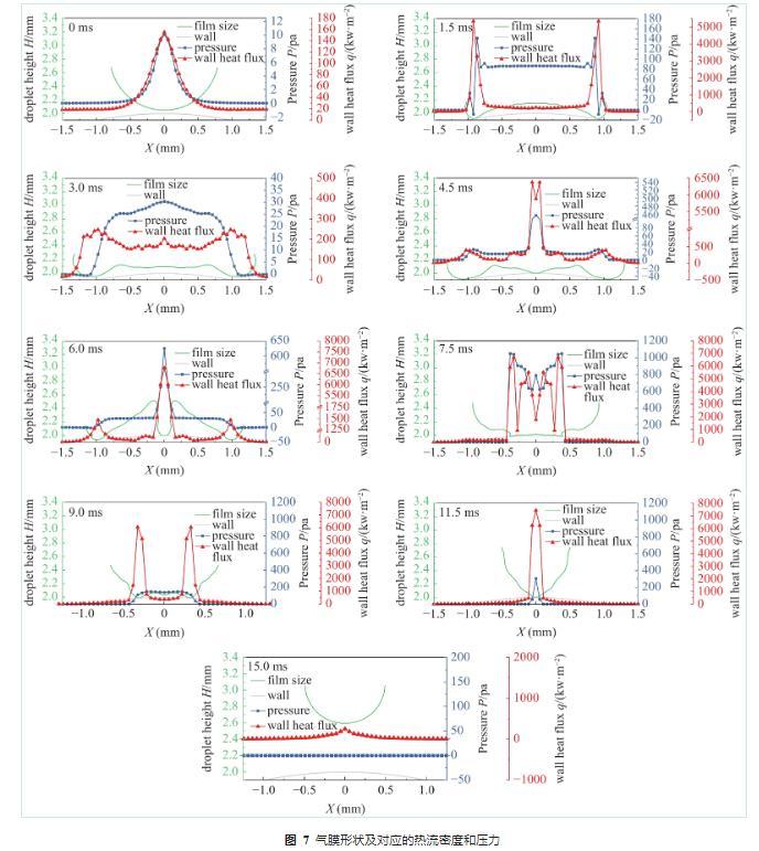 圖7展示了不同球面位置處氣膜厚度、壁面壓力及熱流密度,從圖中可以看出壁面熱流密度及壓力與氣膜厚度的對應(yīng)關(guān)系。當(dāng)t=0.0 ms時,液滴即將撞擊球面,此時中心點氣膜厚度最薄,對應(yīng)的壁面位置壓力與熱流密度都高于其它位置;t=1.5 ms時,液滴向四周鋪展,在距液滴中心大約1 mm處氣膜厚度達(dá)到最低,可以看出熱流密度與壓力都在此處發(fā)生驟增,在距離液滴中心更近的位置又因氣膜厚度增大而驟減,顯然壓力與熱流密度都與氣膜厚度成反比;t=3.0 ms時,液滴繼續(xù)鋪展,邊緣處氣膜厚度升高,熱流密度與壓力都在降低,而邊緣至中心位置氣膜厚度降低,熱流密度略有升高,但氣膜厚度波動較大,因此熱流密度與壓力也出現(xiàn)了不同程度的波動;t=4.5 ms時,液滴鋪展達(dá)到最大,中心位置與邊緣處氣膜厚度都在減小,中心位置氣膜厚度更小,此處熱流密度與壓力增幅更大;t=6.0 ms時,液滴開始彈跳,中心及邊緣處所受壓力增加;t=7.5 ms時,中心位置氣膜厚度較低且波動較大,因此中心位置壓力及熱流密度都發(fā)生了振蕩,變化幅度較大;t=9.0 ms-15.0 ms時段,液滴逐漸脫離熱壁面,氣膜厚度發(fā)生變化,壓力與熱流也隨之變化,直到液滴脫離壁面。