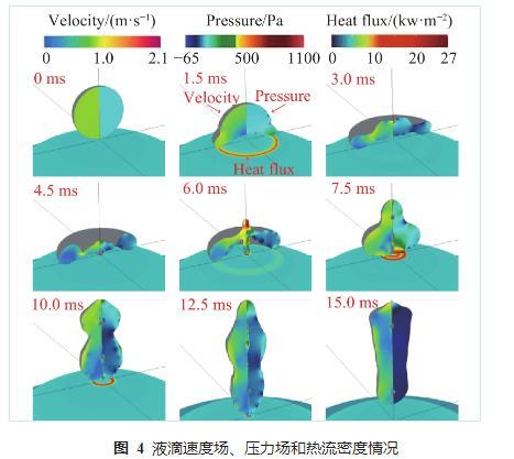 從圖中可以看出,0 ms時,液滴開始接觸壁面,液滴主要在慣性力作用下沿球表面快速鋪展,受球面形狀的影響,重力對液滴的鋪展起到一定作用,液滴通過克服黏性損失和液滴變形將動能轉(zhuǎn)化為表面能;1.5 ms時,由于蒸汽積壓,液滴底部呈扁平狀,此時氣膜較薄,底部球面上存在熱流密度明顯較大的環(huán)狀區(qū)域,同時液滴運(yùn)動方向由軸向開始轉(zhuǎn)變?yōu)閺较颍?.0 ms時,隨著液滴繼續(xù)鋪展,流體向液滴前端積聚,徑向速度與壓力都開始減小,同時,液滴下方蒸汽流出后,周圍空氣沿球面流向液滴底部,形成回流;4.5 ms時,液滴達(dá)到最大鋪展,隨后,在表面張力的作用下開始收縮,外部環(huán)狀區(qū)域壓力與速度都較小,中心點處氣膜較薄,具有較高的熱流密度,同時,因為液滴形成了中間低四周高的結(jié)構(gòu),周圍氣流形成多個渦流;6.0 ms時,液滴逐漸收縮,外側(cè)速度與壓力明顯小于中心內(nèi)部,且液滴運(yùn)動方向由原來的周向變?yōu)檩S向,中心區(qū)域與外側(cè)氣膜厚度都較薄,且中心區(qū)域更薄,因此熱流密度更大,多個渦流都在遠(yuǎn)離液滴;7.5 ms時,液滴進(jìn)一步收縮,外側(cè)速度與壓力都在升高,軸向方向速度減弱,由于液滴底部氣膜厚度不均勻,導(dǎo)致球面熱流密度分布呈多環(huán)形,不同區(qū)域差異較大,同時,因為液滴底部壓力較高,對底部氣膜擠壓作用較強(qiáng),使氣流逸散速度進(jìn)一步提高;9.0 ms-13.0 ms階段,液滴逐漸脫離壁面,壁面熱流密度隨之減小,直到液滴完全脫離壁面,周圍氣流在液滴的帶動下逐漸沿軸向遠(yuǎn)離球面,壁面附近氣流速度逐漸減小。
