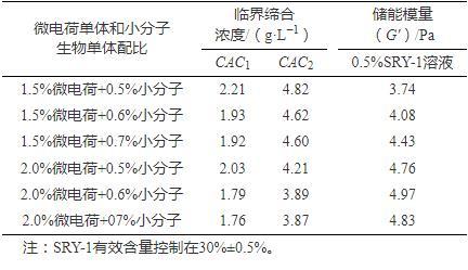 室內(nèi)合成實(shí)驗(yàn)研究發(fā)現(xiàn),微電荷單體對(duì)降低CAC2貢獻(xiàn)較大,用量?jī)?yōu)選為1.5%~2.5%,而小分子生物單體對(duì)降低CAC1貢獻(xiàn)較大,用量?jī)?yōu)選為0.5%~0.7%,兩種單體共同作用下臨界締合濃度降低和黏彈性提高顯著,最優(yōu)結(jié)果見(jiàn)表3??梢?jiàn)當(dāng)采用2.0%微電荷單體+0.6%小分子生物單體組合時(shí),溶液具有較強(qiáng)的黏彈性,此時(shí)SRY-1的CAC1,CAC2分別為1.79 g·L?1、3.89 g·L?1,對(duì)應(yīng)SRY-1用量接近0.18%、0.4%。