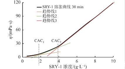 據(jù)研究表明,締合聚合物溶脹經(jīng)歷3個(gè)階段,分別對(duì)應(yīng)了兩個(gè)黏度突變的點(diǎn),即臨界締合濃度CAC;通過(guò)繪制聚合物溶液黏度-濃度曲線,擬合分析得到3個(gè)階段的趨勢(shì)線及公式,兩兩相交的點(diǎn)取絕對(duì)值即為臨界締合濃度值,計(jì)算得CAC1,CAC2,如圖3所示。根據(jù)曲線可以看出,在CAC1之前,溶液黏度增長(zhǎng)趨勢(shì)較緩慢,當(dāng)達(dá)到CAC1并向CAC2過(guò)渡時(shí),溶液黏度增長(zhǎng)相對(duì)加快,超過(guò)CAC2后,溶液黏度迅速增加,1.0%用量下終黏可達(dá)110 mPa·s以上。