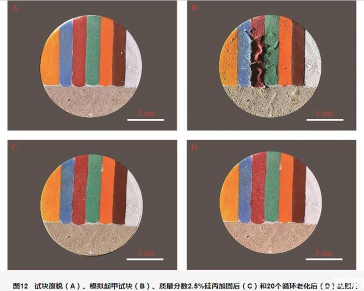 圖12試塊原貌(A)、模擬起甲試塊(B)、質(zhì)量分?jǐn)?shù)2.5%硅丙加固后(C)和20個(gè)循環(huán)老化后(D)的照片