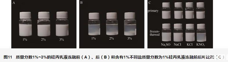 圖11質(zhì)量分?jǐn)?shù)1%~3%的硅丙乳液凍融前(A)、后(B)和含有1%不同鹽質(zhì)量分?jǐn)?shù)為1%硅丙乳液凍融前后對(duì)比圖(C)