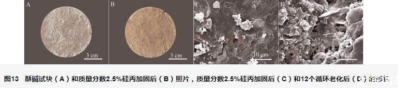 酥堿試塊(圖13A)經(jīng)硅丙乳液修復(fù)后再進(jìn)行濕熱老化12個(gè)循環(huán),肉眼觀察發(fā)現(xiàn)加固后的試塊(圖13B)表面無(wú)酥堿等病害。此外,對(duì)加固后以及12次循環(huán)老化后的試塊進(jìn)行SEM分析。從圖13C可以看出,修復(fù)加固后試塊內(nèi)部能看到明顯的成膜現(xiàn)象,說(shuō)明硅丙乳液滲透加固性較好;而老化12個(gè)循環(huán)后(圖13D),成膜現(xiàn)象仍然存在,進(jìn)一步證明硅丙乳液具有較強(qiáng)的收縮性和耐老化性。因而可以將其作為性能優(yōu)異的膠結(jié)材料用于酥堿壁畫(huà)的修復(fù)中。