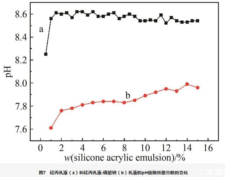圖7硅丙乳液(a)和硅丙乳液-硫酸鈉(b)乳液的pH值隨質(zhì)量分?jǐn)?shù)的變化