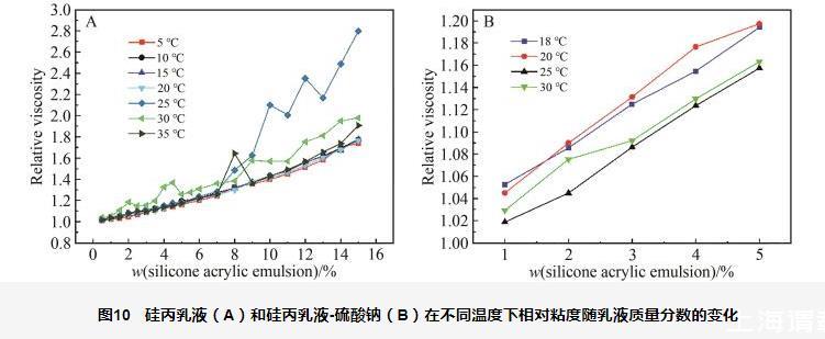 圖10硅丙乳液(A)和硅丙乳液-硫酸鈉(B)在不同溫度下相對(duì)粘度隨乳液質(zhì)量分?jǐn)?shù)的變化