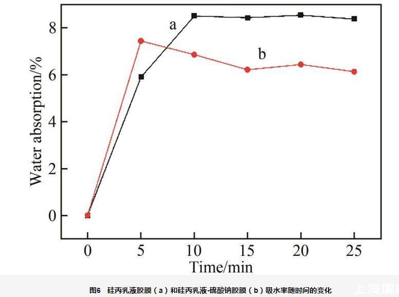 圖6研究了硅丙乳液膠膜和硅丙乳液-硫酸鈉膠膜的吸水率,可以看出,隨時(shí)間增加,硅丙乳液的吸水率也逐漸增大,造成這種現(xiàn)象的原因是硅丙乳液分子結(jié)構(gòu)中的―OH和―COOH遇到水分子時(shí)形成氫鍵,在范德華力和氫鍵作用下,膠膜表現(xiàn)出一定的吸水性。另外,從圖6還可看出,硫酸鈉膠膜的吸水率較小,這是因?yàn)槟z膜網(wǎng)絡(luò)結(jié)構(gòu)中的硫酸鈉在水中完全電離,膠膜三維網(wǎng)絡(luò)結(jié)構(gòu)中的Na+對(duì)膠膜中的―COO-產(chǎn)生電荷屏蔽效應(yīng),使膠膜三維網(wǎng)絡(luò)結(jié)構(gòu)內(nèi)外溶液的滲透壓差降低。同時(shí),外部溶液中的Na+與網(wǎng)絡(luò)結(jié)構(gòu)中的―COO-發(fā)生“離子交聯(lián)”,導(dǎo)致膠膜網(wǎng)絡(luò)結(jié)構(gòu)中有效交聯(lián)密度增大,吸水率下降。