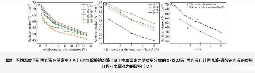 圖9不同溫度下硅丙乳液在蒸餾水(A)和1%硫酸鈉溶液(B)中表面張力隨質(zhì)量分?jǐn)?shù)的變化以及硅丙乳液和硅丙乳液-硫酸鈉乳液的質(zhì)量分?jǐn)?shù)對(duì)表面張力的影響(C)