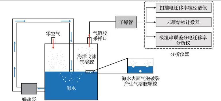SSA生成裝置能夠在實(shí)驗(yàn)室環(huán)境中模擬自然海洋系統(tǒng),實(shí)現(xiàn)在受控條件下從天然海水中產(chǎn)生SSA,并結(jié)合儀器表征顆粒的粒徑分布和理化特性。目前常用的模擬裝置有鼓泡式發(fā)生器、射流式發(fā)生器及波浪破碎式發(fā)生器等。本文以射流式SSA發(fā)生器為例,介紹SSA的生成原理(圖2)。通常來說,發(fā)生器都具有進(jìn)水口、進(jìn)氣口和采樣口。利用蠕動泵將海水從發(fā)生器底部周期性循環(huán)到頂部噴嘴,形成一個俯沖射流水柱,撞擊水面并將空氣夾帶進(jìn)入海水中,在水下一定深度產(chǎn)生氣泡羽流。當(dāng)氣泡上升到水氣界面并破裂時,產(chǎn)生SSA顆粒。采用潔凈零空氣作為載氣,將生成的SSA顆粒通過氣溶膠采樣口進(jìn)行采集,連接干燥管進(jìn)行干燥。此后,使用掃描電遷移率粒徑譜儀測量SSA的粒徑分布和數(shù)濃度等。該裝置可連接其他儀器,如CCN計數(shù)器和吸濕串聯(lián)差分電遷移率分析儀等進(jìn)行CCN活性及吸濕性等的表征。